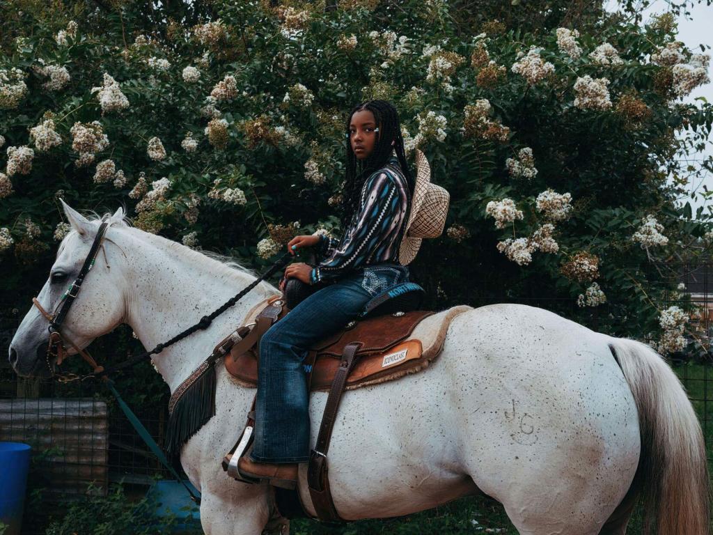This photograph presents a young black cowgirl, dressed in the traditional Western attire of a printed shirt, blue jeans, boots, and a cowgirl hat. Seated confidently upon a white horse, its coat speckled with black spots and bearing the initials JG on its hindquarters, she gazes back at the photographer. The backdrop features a lush bush or tree, reminiscent of a hydrangea, with large white blooms cascading downwards and rich green foliage obscuring the sky. Despite the image’s seemingly solemn atmosphere, McClellan revealed that the young girl, merely eleven years of age, exudes a spirited, spunky demeanor. He shared with the audience her true character, adding another layer of depth to the powerful visual narrative. “She actually art directed this photo”, Ivan chuckles, “‘Before this shot, she was smiling and told me to wait and then struck this pose”.